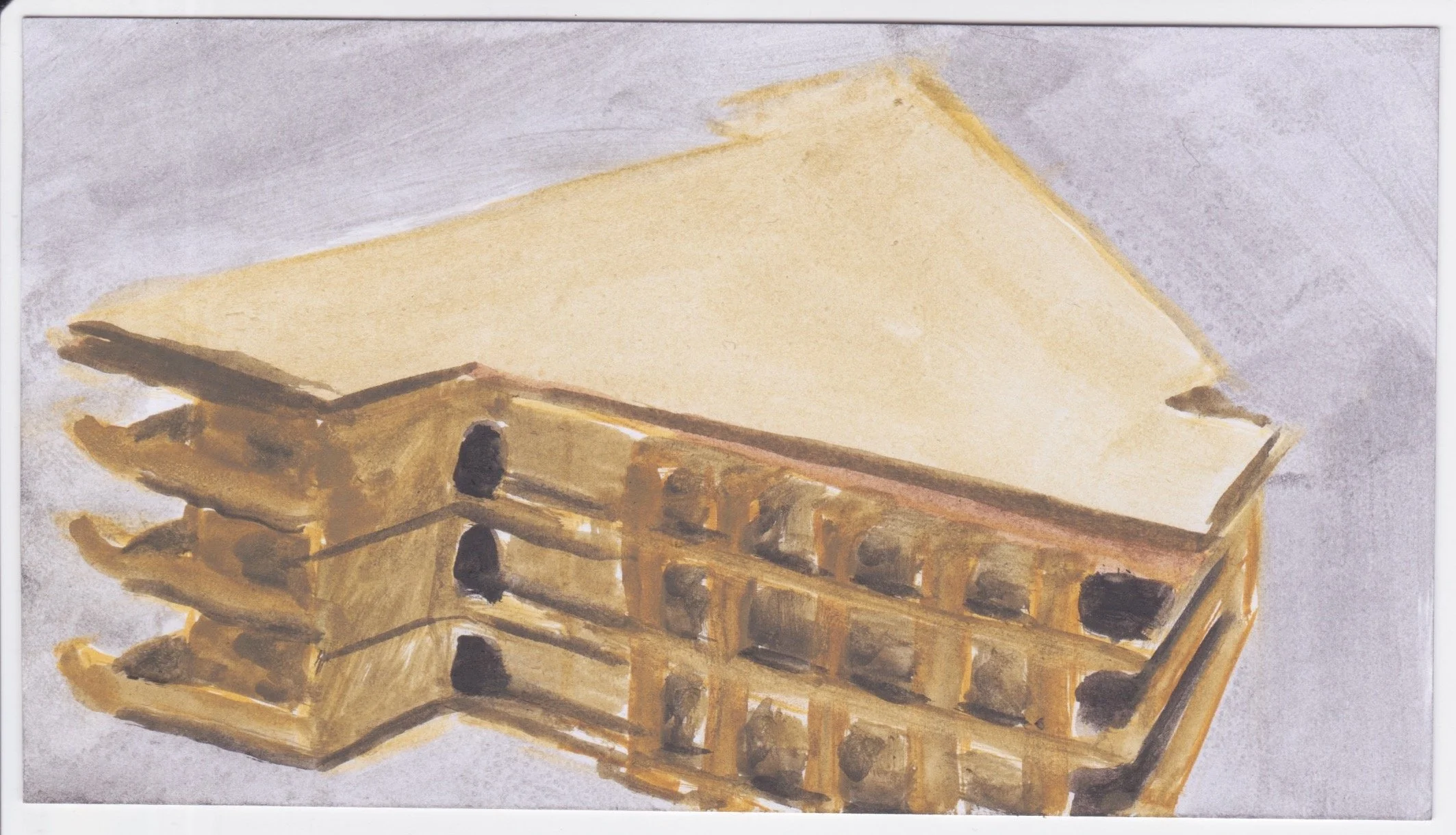 Coincidentally, the phrase ‘The use of repeating motifs’ is a line I hear myself recalling every day at work in my role as architecture tour guide around London’s Barbican Centre. Having now worked here for eight years (not always as a tour guide) I have come to love the estate: the whole 40-acre site a giant work of art, what the German’s call a gesamkunstwerk. Simple forms make up the buildings and four motifs dominate: the semi-circle, the Egyptian cartouche, stepped Crennelations and Modernist arrow loops. The economy and scale of the whole place is astonishing and I could learn a lot from Chamberlin, Powell and Bon the estate’s architects. To this end, I’ve began to construct a replica of one of its iconic towers: the Shakespeare Tower.
